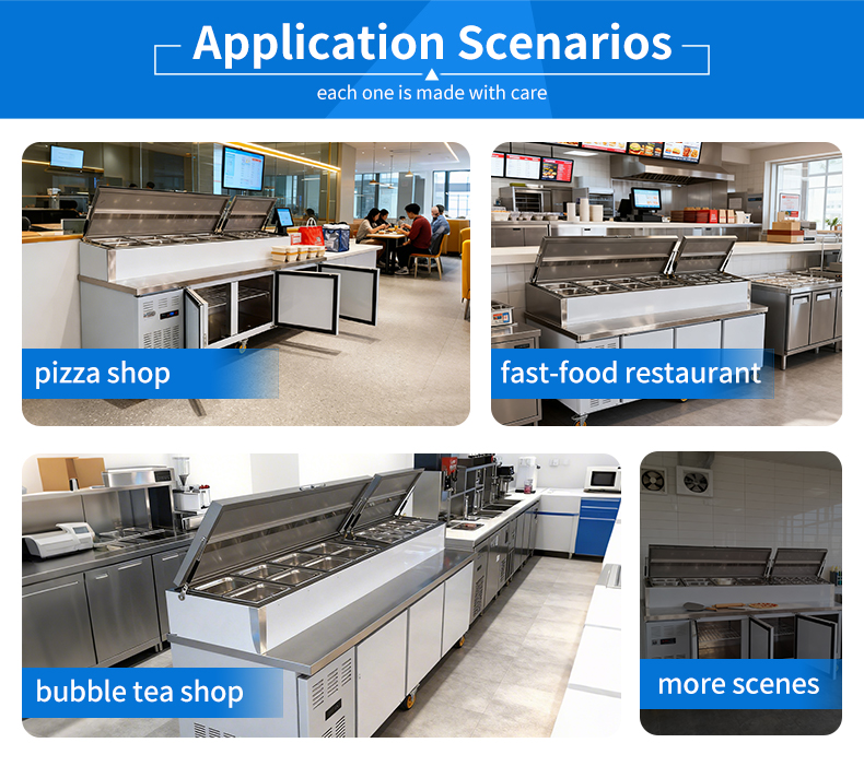 The commercial kitchen stainless steel refrigerated operation table with multi-compartment fresh-keeping rollers is easy to move